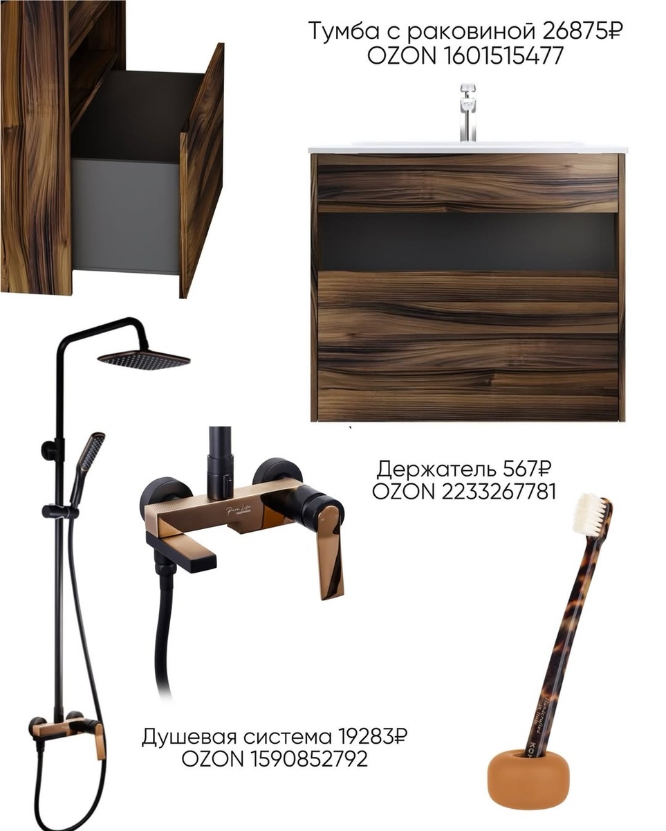 Эти 13 артикулов с OZON складываются в гибкую капсулу: хотите уютное дерево — берите тумбу 1601515477 и душ 1590852792; тянет к отельному лоску — добавляйте нюдовую мебель, золото и белую ванну; любите эффект — делайте ставку на стекло «шампань». Список выше — ваша готовая карта покупок. Сохраните и собирайте интерьер, который радует каждый день.
