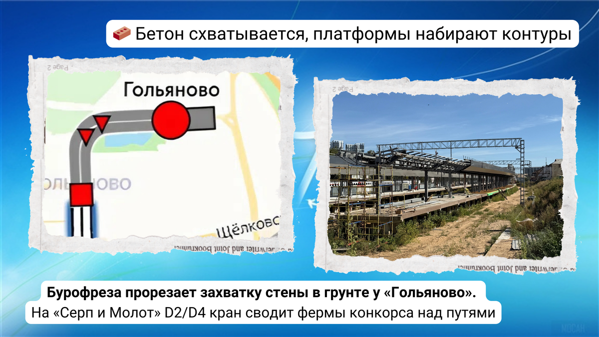 официальные отчеты. Давайте вместе разберемся, что же на самом деле происходит с нашей Москвой. Поехали? Во-первых, хотим сообщать, что продолжаются работы по устройству стены в грунте – ограждения огражадющей стены из монолитного железобетона по контуру будущего котлована станции 🚇«Гольяново» Арбатско-Покровской линии. Вокруг котлована укладываются плиты для размещения на них строительной техники и материалов. 📷 1.9-1.10: Возводится и западная, торцевая стена, через которую финишируют в котлов