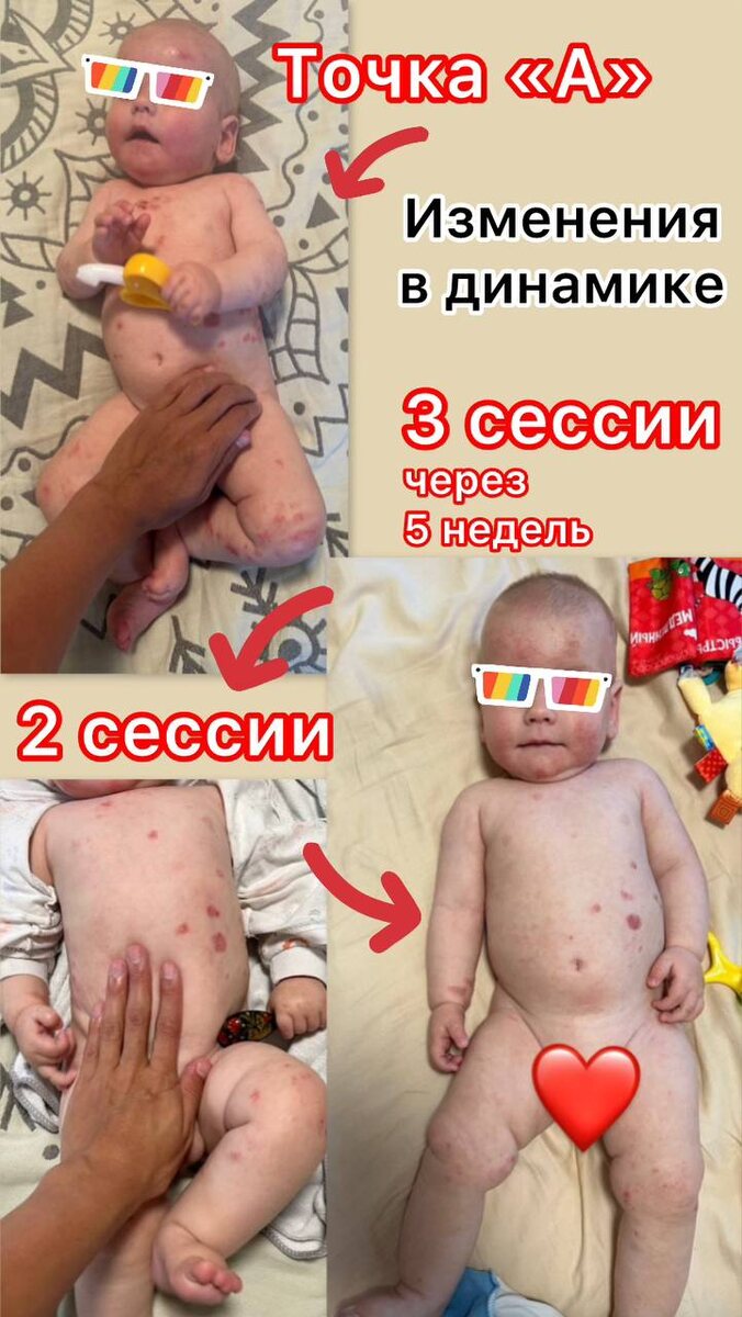 Хочу поделиться результатами. Они промежуточные. Мы продолжаем работу. Я горжусь результатами этого замечательного малыша и его мамы. Горжусь той работой, которую проделала Александра. Горжусь своим терапевтическим вкладом😊 и радуюсь. На момент этих фотографий было проведено три сессии. Изменения налицо! и ещё кое-где). Кожа восстанавливается. Зуд стал меньше беспокоить. Ребёнок стал спокойнее, лучше спит, и, соответственно, мамино состояние тоже улучшилось. Фото использовано с разрешения