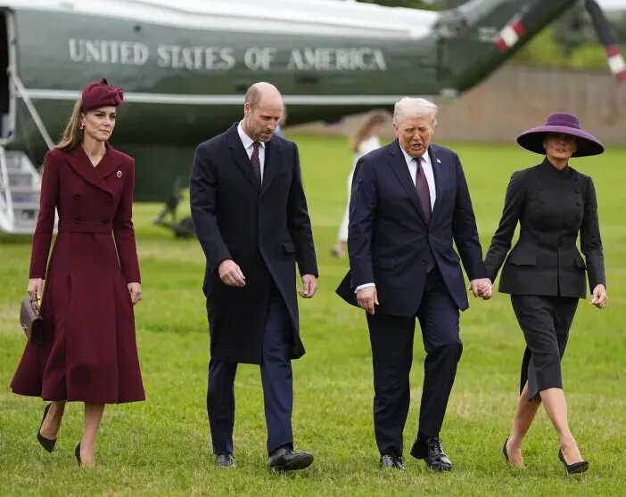 Для официального приема 43-летняя принцесса Уэльская выбрала элегантное бордовое платье от Emilia Wickstead, дополнив его шляпкой Jane Taylor в тон. 55-летняя Мелания Трамп, в свою очередь, предстала в строгом ансамбле от Dior — черный приталенный жакет с юбкой-карандаш и контрастная фиолетовая шляпа. Как сообщается, 79-летний Дональд Трамп лично сделал будущей королеве комплимент, отметив: «Вы прекрасны». Этот эпизод невольно напомнил о его резком высказывании о Меган Маркл, которую он несколько месяцев назад назвал «ужасной».