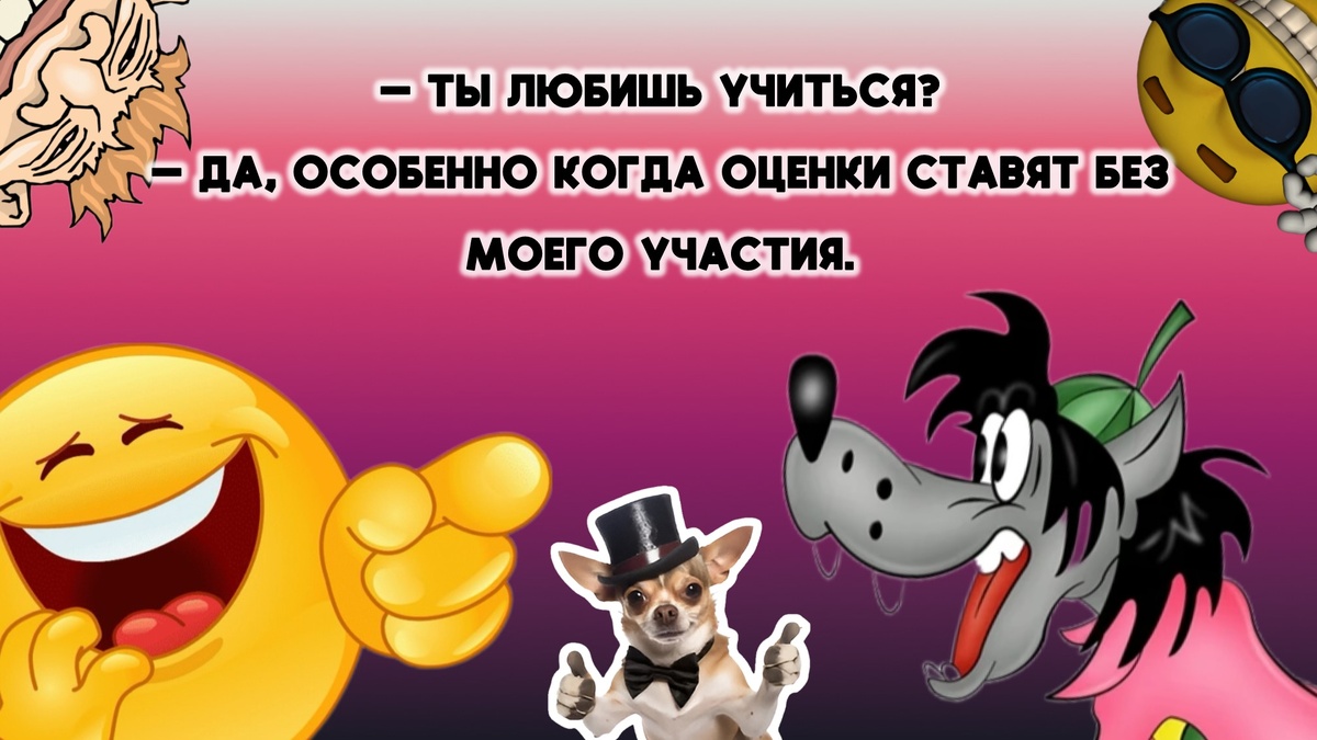 1. Идёт ёжик по лесу, видит — машина в яме. Из машины — волк. Ёжик спрашивает: «Волк, что случилось?». Волк: «Да вот, GPS сломался, карту в телефоне не вижу...». Ёжик: «Так ты скачай навигатор!». Волк: «А у меня иголки торчат, экран поцарапаю». 2. Почему у кальмара нет персонального тренера? Потому что он и так всегда работает на все свои десять конечностей. 3. Объявление в зубной клинике: «Пациенты, не выдавливайте пасту на щётку характерным движением руки вдоль тюбика. Вы же не наносите майонез на хлеб бутылкой?». 4. Прибегает сын к отцу: «Папа, папа, наша черепаха застряла в панцире!». Отец: «Опять ты её в микроволновку сунул?». 5. Сидят два робота в баре. Один говорит: «01001000 01101001!». Второй отвечает: «Дружище, не заводи разговор о работе!». 6. Научил кота приносить тапки. Теперь он приносит все правые. Видимо, левые ему кажутся политически некорректными. 7. Жена говорит мужу: «Если ты умрёшь, я повезу тебя на кладбище на «Запорожце». Муж растроганно: «Это так трогательно, на