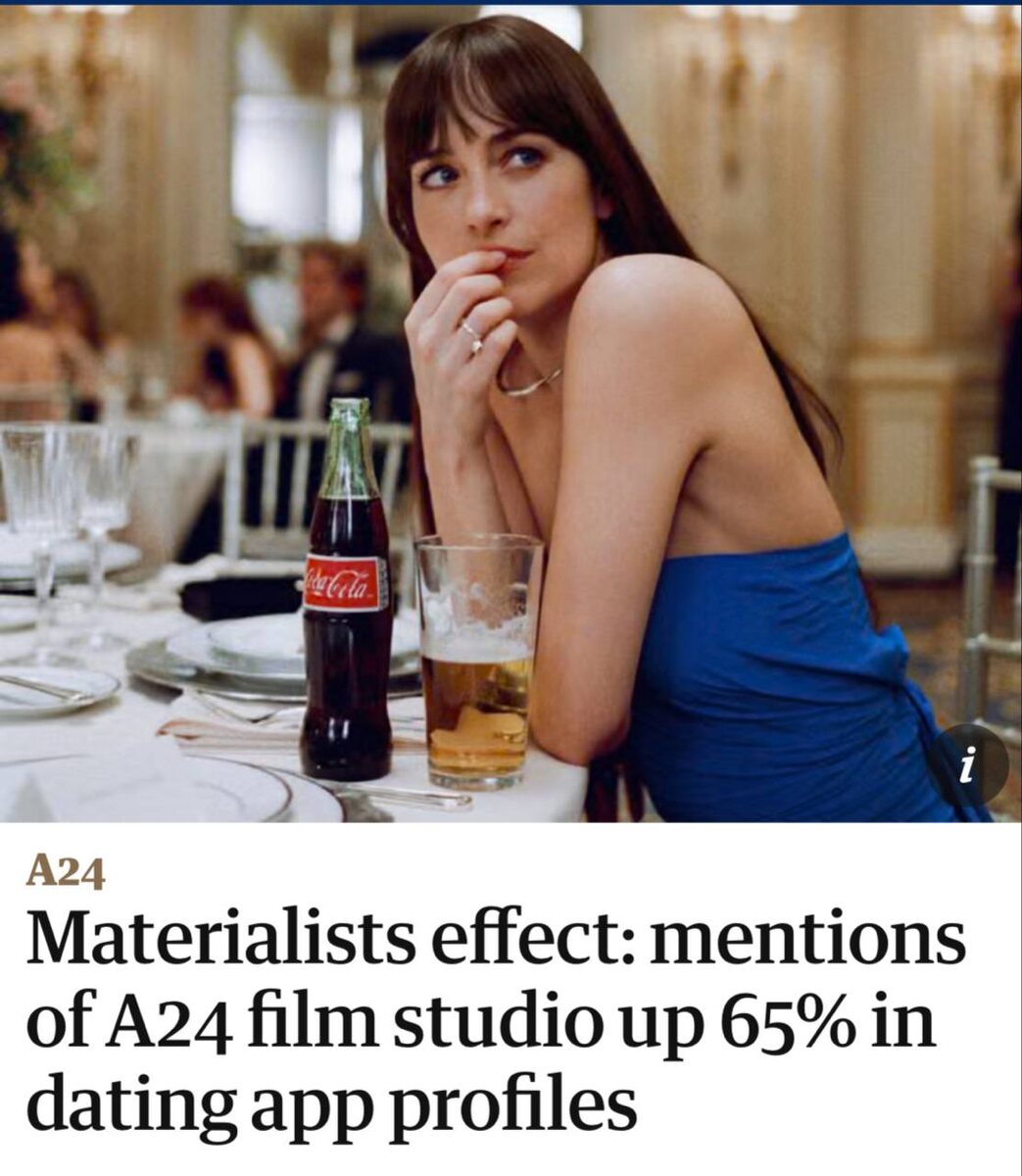 По причине отсутствия идей и масштабной пресыщенности у мужчин стало снова модным… разбираться в кино (сколько их «Гвоздики» насмотрелись, не будем показывать пальцем). Пишут, что упоминания кинокомпании A24 в анкетах приложения для знакомств увеличились на 65% за последний год. Так называемые киноманы преимущественно в возрасте от 25 до 30 лет пытаются добиться женского внимания посредством якобы просмотра «Человек — швейцарский нож», «Материалистки» и «Солнцестояния». «Гвоздики» умоляют, только не возвращаетесь к «шарфам художников» и вину из пакета, всё и так уже донельзя убого.
