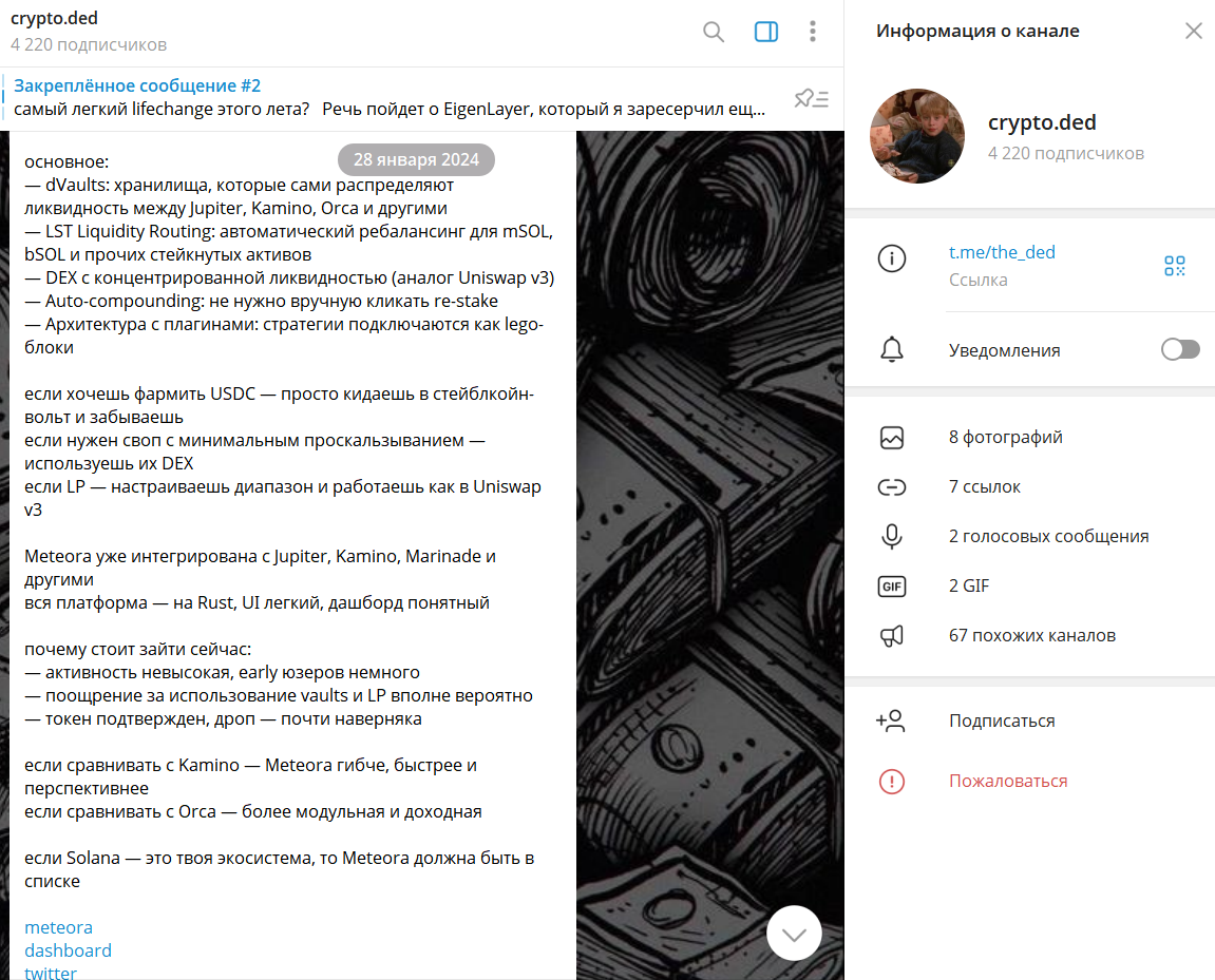 Канал crypto.ded насчитывает около 4 тысяч подписчиков и подаётся как авторский блог о криптовалютах и DeFi. Основное содержание — обзоры протоколов, новых решений для фарминга, ликвидности и стейкинга. Автор пишет в простом стиле, часто называет вещи своими именами и делает упор на практическое применение. ✅ Кстати, проверенный метод заработка здесь ◀️ В отличие от большинства крипто-каналов, здесь меньше рекламы и больше «технических разборов». Однако остаётся вопрос: насколько эти обзоры объективны, и нет ли скрытой рекламы протоколов? Таким образом, канал позиционирует себя как «образовательный ресурс», но фактически подаёт материалы в формате «обзоров-подсказок». 🔹 «Нравится стиль автора — коротко, понятно, без воды».