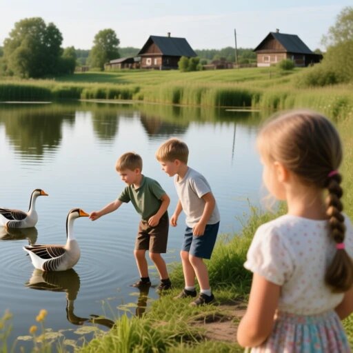 Наше любимое место для игр и шалостей располагалось у старого пруда, что раскинулся на окраине деревни. Пруд этот был настоящим царством гусей. Их было много, и они, казалось, владели этим местом по праву рождения. Белые, с горделивыми шеями, они важно вышагивали по берегу, издавая свои характерные шипящие звуки, которые мы, дети, интерпретировали как нечто среднее между угрозой и презрением.