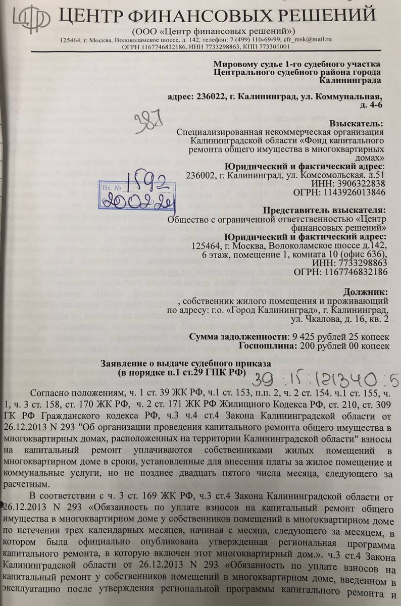 22 апреля 2024 года мировым судьёй 1-го судебного участка Центрального судебного района города Калининграда был вынесен судебный приказ №2-1925/2024, по которому мой клиент является должником. Изучением материалов дела №2-1925/2024 установлено, что судебный приказ был вынесен в связи с наличием задолженности по оплате коммунальных услуг за объект недвижимости по адресу г. Калининград, ул. Чкалова, д. 16, кв. 2, при этом мой клиент к данной квартире не имеет никакого отношения, никогда не был зарегистрирован по данному адресу, никогда там не проживал и не владел данной недвижимостью. Что ещё очень любопытно - в материалах дела отсутствуют какие-либо документы, подтверждающие связь моего клиента с указанным адресом. Как так вышло - пока остаётся загадкой.