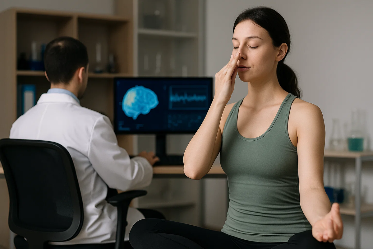 Группа индийских ученых из Института передовых исследований Шри Шри получила уникальные данные о том, как дыхательные практики влияют на мозг человека. Результаты исследования опубликованы в журнале Nature. В центре внимания оказалась техника Сударшан Крия — особый метод ритмического дыхания. Его разработал индийский гуру Шри Шри Рави Шанкар в 1982 году во время десятидневного молчания в городе Шимога. В исследовании участвовали 43 опытных людей, которые уже практиковали йогу. Их средний возраст составлял 25 лет. Стаж занятий варьировался от года до 18 лет. Для сравнения набрали контрольную группу из 10 человек. Они просто слушали спокойную музыку. На голову участников надевали специальную шапочку с 24 электродами для записи ЭЭГ. Весь сеанс разделили на пять этапов: Во время дыхательных практик мозг участников начинал работать совершенно иначе. Альфа-волны, которые обычно появляются при закрытых глазах, резко снижались. Особенно заметно это было в теменной и затылочной областях. Актив