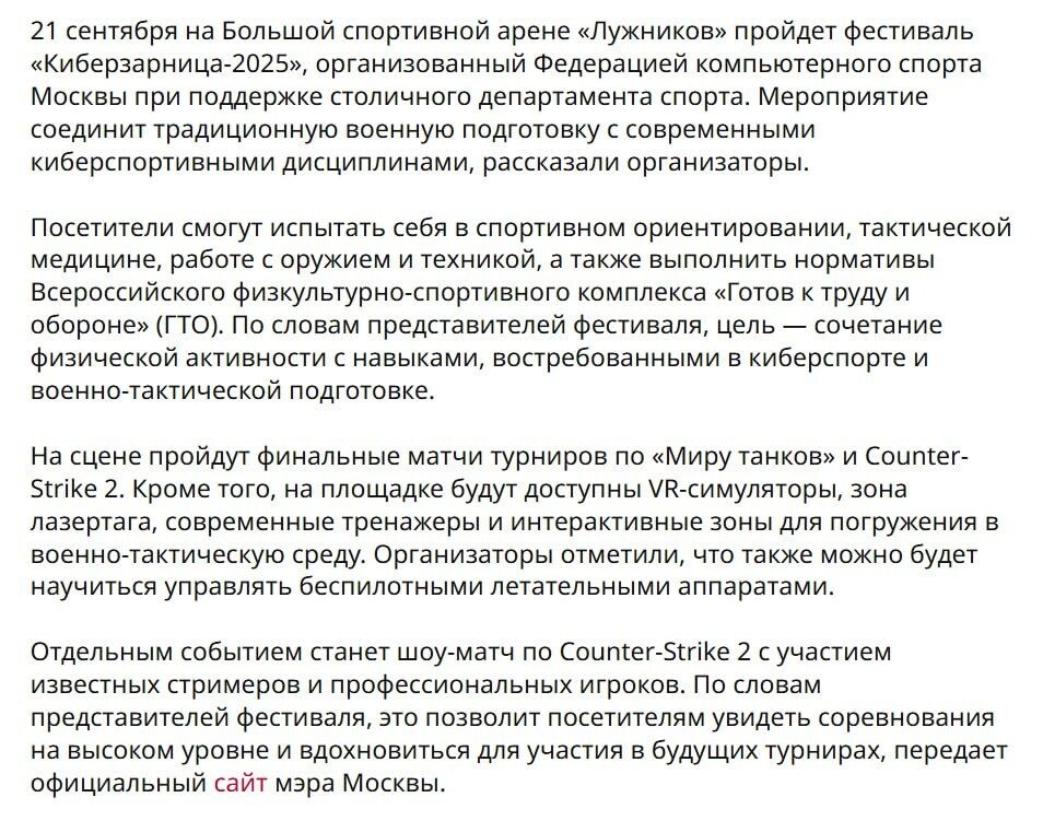 В Москве на территории спортивного комплекса «Лужники» пройдёт грандиозный фестиваль «Киберзарница-2025». Это мероприятие обещает стать уникальным сочетанием традиционной военной подготовки и современных киберспортивных дисциплин. 🏟️🎮 Фестиваль соберёт участников со всей страны, которые смогут продемонстрировать свои навыки как в реальных, так и в виртуальных сражениях. В рамках мероприятия на главной сцене пройдут финальные матчи по популярным киберспортивным дисциплинам, таким как «Мир танков» и Counter-Strike 2. 💥 Организаторы обещают зрелищные соревнования, мастер-классы от профессиональных киберспортсменов и военные тренировки. Это будет отличная возможность для молодёжи проявить себя в различных областях и найти новых друзей по интересам. 🤝 «Киберзарница-2025» станет важным событием в мире киберспорта и военной подготовки, объединив лучших из лучших в этих областях. 🔗 Больше новостей смотрите на News.Mentup