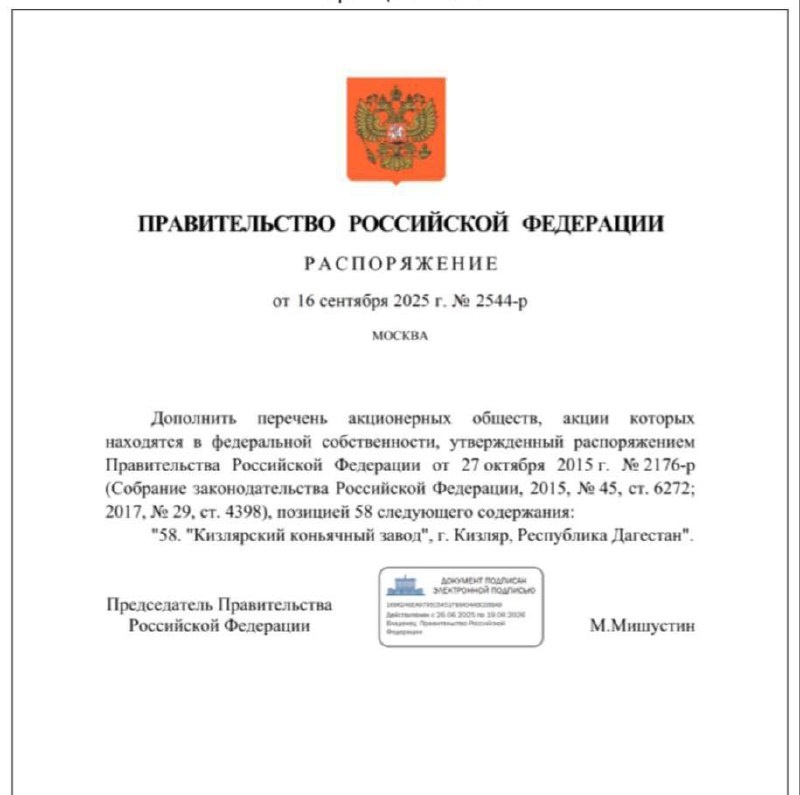 В России продолжается перераспределение активов — акции знаменитого Кизлярского коньячного завода перешли в федеральную собственность — распоряжение председателя правительства России Михаила Мишустина. (@tolko_fakti_Dagestan)
