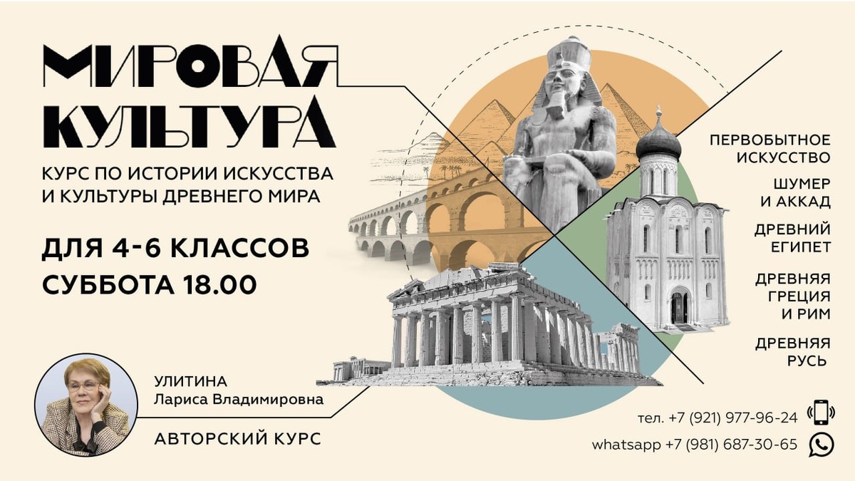 💫💫💫 20 сентября в 18.00 мы возвращаемся к любимому курсу и детей, и их родителей! ДРЕВНИЙ МИР - ИСТОРИЯ ИСКУССТВА И КУЛЬТУРЫ. 📍ПОЧЕМУ К ЭТОЙ ПРОГРАММЕ НЕИЗМЕННЫЙ ИНТЕРЕС И ДЛЯ КОГО ОНА ВАЖНА? Особо я выделяю учебный год 4-го класса! И отзывы родителей это подтверждают. Мама ученика 4-го класса пишет: "Лариса Владимировна, я хочу от всей души Вас поблагодарить за курс МХК! У Вас прекрасная подача материала - понятная, интересная и очень ёмкая. Когда получалось, сама присаживалась рядом и слушала Вас с удовольствием!!Отдельное спасибо за детальную обратную связь по заданиям и рекомендации по книгам. Все берём на вооружение! Но самое главное - им мало😊😊, хотят продолжения летом! Мы ЗА всеми руками и ногами!" Мама ученика 5-го класса: "Мне очень нравится то, что происходит на Ваших уроках. Это качественная тренировка мышления, включающая и развитие речи, и умение анализировать, идти в глубь вопроса, где удаётся и восполнить пробелы школьной программы, и пофилософствовать , и вспом