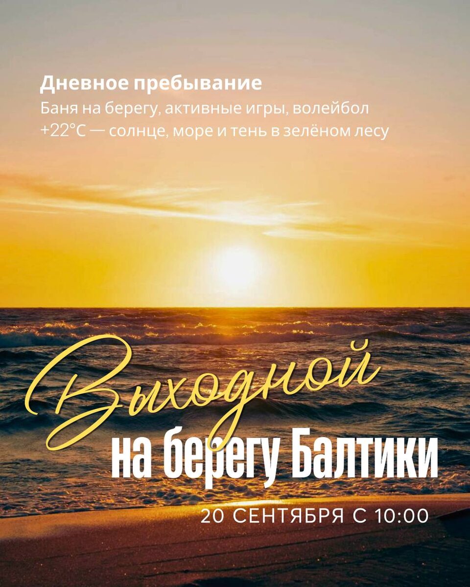 20 сентября — «Spa & Sport day». День, который запомнится надолго! 🔥 Представьте: настоящая баня на самом берегу Балтийского моря! Пар, березовые веники и бескрайние морские просторы — сочетание, от которого захватывает дух 🌊 Что вас ждет: ✔️ Баня с панорамным видом на море — парьтесь и любуйтесь закатом одновременно ✔️ Волейбол на песчаном пляже — азарт игры под шум прибоя ✔️ Дневное пребывание всего за 250₽ — целый день на «Территории Я» ✔️ Дети приходят бесплатно — пусть малыши наслаждаются природой без ограничений ✔️ Животные тоже бесплатно — ваши четвероногие друзья станут частью приключения После бани — прыжок в освежающее Балтийское море, партия в волейбол на мягком песке, а вечером — костер под звездами. Бронируйте место заранее — таких дней не бывает много! 🏖️