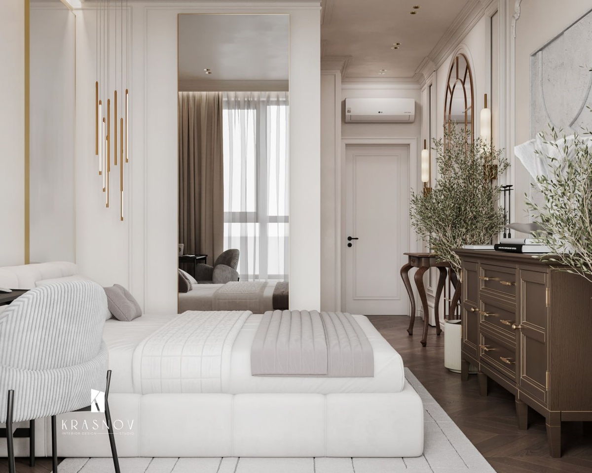 #KRASNOV_МалаяПочтовая После кухни-гостиной мы попадаем в спальню — пространство, где атмосфера уюта соединяется с лёгкой архитектурной строгостью. Основу задаёт та же спокойная палитра, каждый тон работает на ощущение гармонии и продолжает идею зелёных акцентов, которые связывают все помещения. Стены оформлены молдингами с тонким рельефом. Это не декоративная перегрузка, а сдержанный намёк на классику, который придаёт глубину и завершённость. На фоне лаконичных стен особенно выразительно смотрятся подвесные светильники в латунном исполнении — они словно тонкие линии графики в интерьере. Особое внимание мы уделили рабочей зоне. Небольшой стол встроен в пространство так, что он не выглядит отдельным предметом, а становится частью архитектуры, а кресло интересной фактуры, с мягкой обивкой — делает этот уголок комфортным не только для работы, но и для вечернего чтения. Живые деревья в кашпо добавляют свежести и соединяют спальню с общей концепцией квартиры, где природа — полноправный