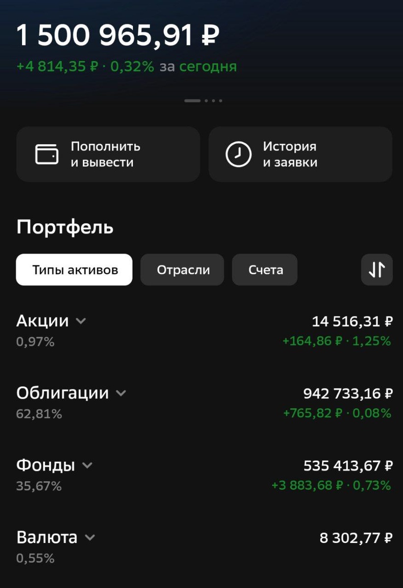 Хочу поделиться радостью! Сегодня мой портфель на ИИС впервые превысил 1,5 млн. ₽ 📈 Важны, конечно, не ситуативные колебания. Просто приятно преодолеть очередной порог. Фонды на российский рынок акций составляют лишь 1/3 портфеля, планирую их докупать на просадках. 👍 PS: итоговую доходить посчитать крайне тяжело, учитывая, что бумаги покупались последние 3 года, а дивиденды и купоны вообще выводились на карточку)
