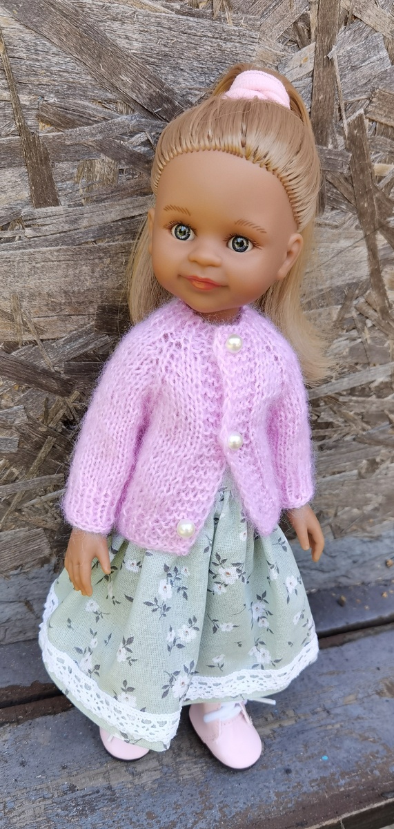 И юбку сшила. Давно лежал у меня кусок ситца зеленоватого оттенка. Все думала - кому он подойдет, потому что идет он многим куклам Бланке Готц, например. Но достался он Ириске, так как очень нежно, на мой взгляд, оттенил розовый цвет кардигана.