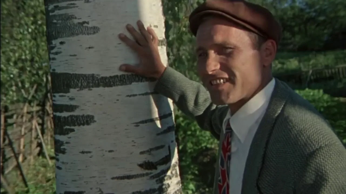 Вот такой вопрос стал предметом для обсуждения в комментариях в статьям о фильме Василия Шукшина "Калина красная". Мнения разделились: одни комментаторы утверждают, что после отсидки до его гибели прошла пара месяцев, другие считают, что прошёл год. Давайте разбираться. Будем отталкиваться от времени освобождения Прокудина. Когда он выходит через КПП или как там это называется, то в дверном проёме прекрасно видно дерево, всё в зелени: Обратите внимание на хронометраж внизу скрина. Когда он едет с таксистом домой, видно, что вдоль дороги уже выросла трава: То есть, это начало мая. Но буквально через минуту прямо в процессе разговора пейзаж резко меняется на мартовский: Никакой зелени, деревья голые, грачи вьют гнёзда. Это, конечно, очевидный ляп. Не могли они за секунду оказаться в другом климатическом поясе. Идём дальше. Прокудин на катере. И мы снова видим зеленые деревья: Прокудин приезжает в деревню. Снова вполне буйная листва: На реке мальчишка уже загорает: Когда Прокудин закат