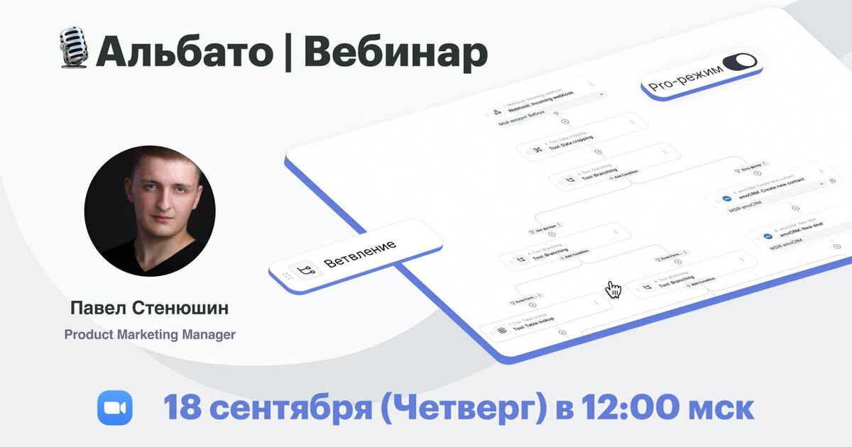 🎙Вебинар. Обновление Альбато: Pro-режим, ветвления и новые сервисы Уже завтра, 18 сентября проводим вебинар, где покажем, как обновления платформы помогут ускорить работу и расширить возможности интеграций. В программе: – Что нового в Pro-режиме конструктора и как работать быстрее. – Как использовать инструмент «Ветвление» для гибких сценариев. – Покажем новый принцип тестирования шагов. – Расскажем про подключение сервисов по ссылке. После основной части будет открытый микрофон: команда Альбато ответит на ваши вопросы в прямом эфире. Регистрируйтесь через Телеграм-бота, чтобы не пропустить @albato_bot