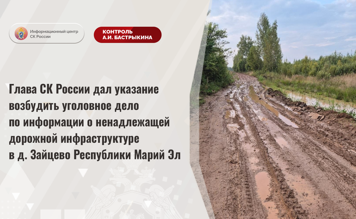 Глава СК России дал указание возбудить уголовное дело по информации о ненадлежащей дорожной инфраструктуре в д. Зайцево Республики Марий Эл В СМИ сообщается о нарушении прав жителей деревни Зайцево Республики Марий Эл на качественную дорожную инфраструктуру. На протяжении нескольких лет подъездная дорога находится в непригодном состоянии: асфальтовое покрытие отсутствует, на поверхности образовались многочисленные ямы и колеи, грунтовое полотно при выпадении осадков размывается. В связи с этим проезд в населенный пункт транспортных средств, в том числе экстренных служб, затруднен. Отмечается, что в июне текущего года бригада скорой помощи не смогла своевременно прибыть на вызов, что привело к смерти одного из жителей. Обращения граждан, в числе которых пенсионеры и инвалиды, в различные инстанции результатов не принесли. В СУ СК России по Республике Марий Эл проводятся процессуальные проверки. Председатель Следственного комитета Российской Федерации Александр Иванович Бастрыкин поручи