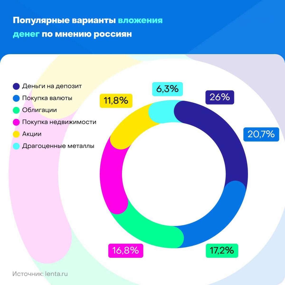 Каждый четвёртый (26%) выбирает депозит - проверенный и спокойный вариант. На втором месте - покупка валюты (20,7%), за ней следуют облигации (17,2%). Недвижимость остаётся привлекательной для 16,8% респондентов. Акции интересуют 11,8%, а драгоценные металлы - 6,3%.