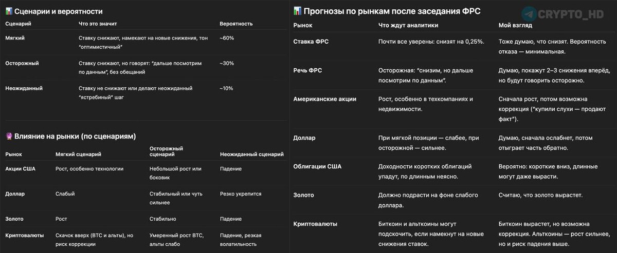 ❗️Потенциальное влияние заседания ФРС на рынок (по версии GPT-5). ➥ Базовый сценарий (вероятность = 60%): - Снижение ставки на 0,25% + осторожный намек на будущие смягчение ДКП. Рост акций, крипты, золота и ослабление доллара. Есть риск коррекции рынка. ➥ Бычий сценарий (30%): – ФРС явно сигнализирует о серии новых снижений ставки. Акции уверенно растут (особенно техи), доллар теряет позиции, золото обновляет максимумы, ралли на крипторынке. ➥ Медвежий сценарий (10%): – ФРС не снижает ставку или Джером Пауэлл дает «ястребиный» сигнал в своем выступлении. Акции под давлением, доллар резко укрепляется, золото и крипта проседают, волатильность растет. Crypto Headlines