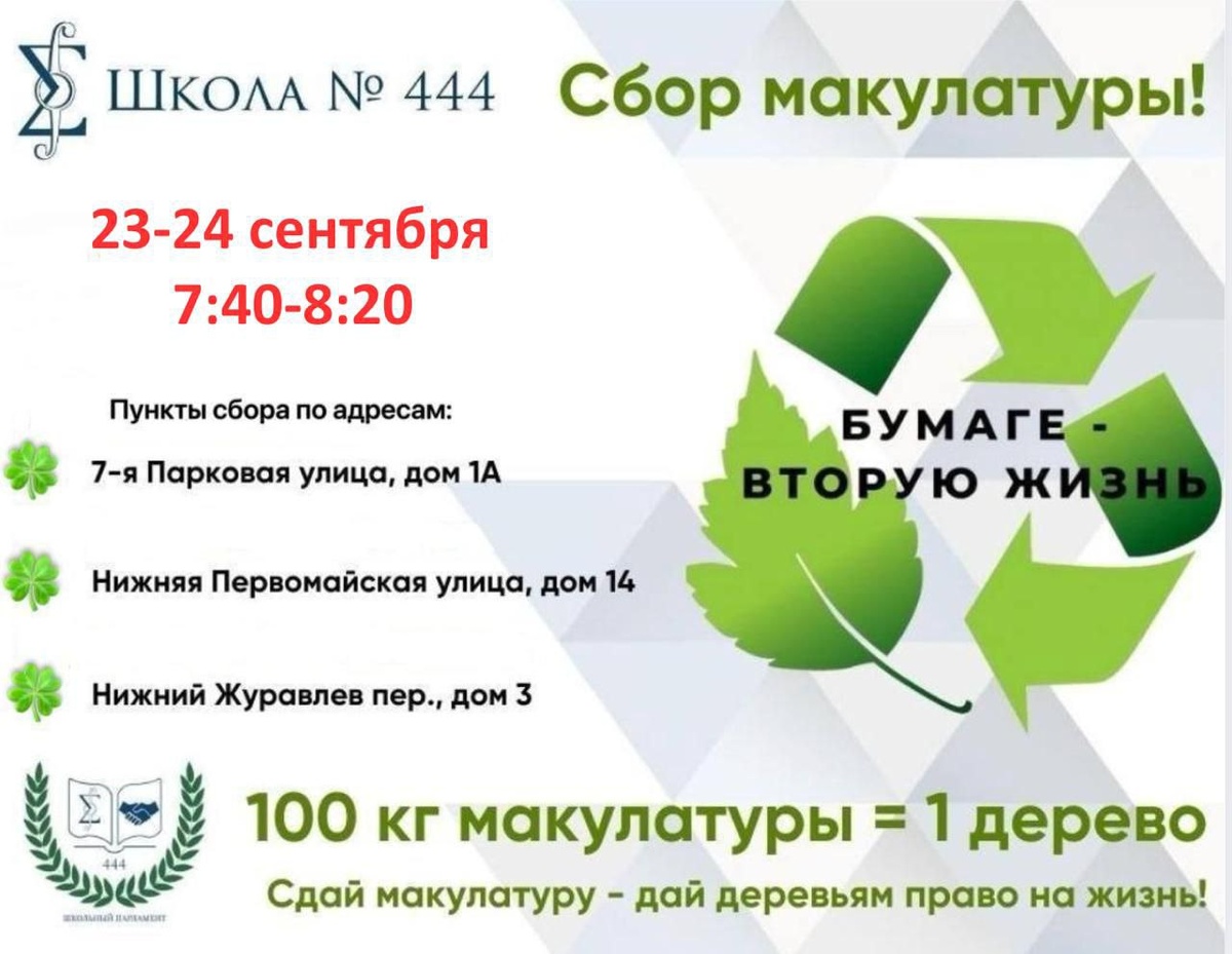 📢 23 и 24 сентября с 7:40 до 8:20 в нашей школе состоится сбор макулатуры, организованный школьным самоуправлением. Пункты сбора будут организованы по адресам: 🍀 ул. 7-я Парковая, д. 1А 🍀 Нижний Журавлев пер. д. 3 🍀 ул. Нижняя Первомайская, д. 14 ✍️ Макулатуру необходимо крепко связать и хорошо упаковать. Когда вы сдадите макулатуру, запишитесь у волонтера из числа членов школьного самоуправления. #Школа444Москва #ТриЧетверки #МРСД12 #ДОНМ #ШколыКолледжиМосквы #444СборМакулатуры