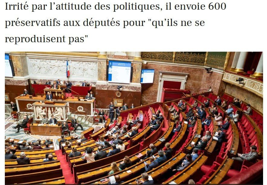 Во Франции мужчина прислал 600 презервативов в Национальное собрание, считая, что депутаты из-за своего поведения не должны размножаться, - La Depeche. In Frankreich schickte ein Mann 600 Kondome an die Nationalversammlung, weil er der Meinung war, dass sich Parlamentsabgeordnete aufgrund ihres Verhaltens nicht fortpflanzen sollten – La Depeche.