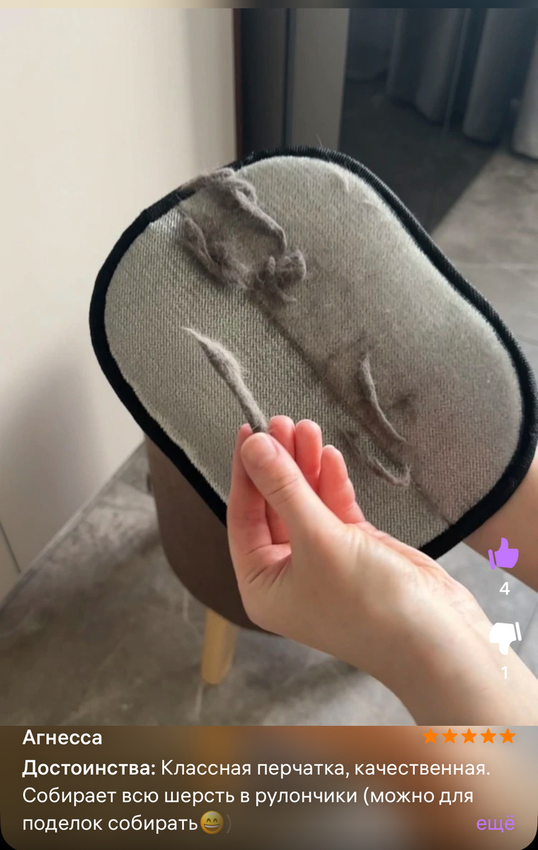 Вечно шерсть на диване и одежде. Кошка не любит щётки — царапается и убегает. Липкие ролики заканчиваются слишком быстро. Хотелось что-то простое и недорогое. На WB у этой перчатки куча заказов и отзывов. Что говорят покупатели «Очень удобно! За 5 минут сняла столько шерсти, сколько раньше не удавалось щёткой за неделю». «Кошка мурчит, когда я её чешу этой перчаткой». «На диване собирает отлично, на одежде похуже, но зато быстро». Плюсы и минусы Плюсы: ✔ Животным нравится (эффект массажа). ✔ Подходит для мебели, ковров, пледов. ✔ Лёгкая очистка — просто стянул шерсть. ✔ Цена доступная. Минусы: ✖ Размер может быть великоват для маленькой руки. 3 лайфхака для максимального эффекта Используй ее когда шерсти много, так она будет скручиваться в жгутики Храни под рукой на диване — так будет проще убрать шерсть «по пути». Итог: стоит ли брать? Если в доме есть пушистик, а ты устала от шерсти везде — эта перчатка реально упрощает жизнь. Она не заменит фурминатор, но для ежедневного ухода и