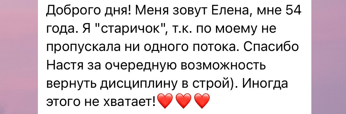 🌸 «Меня зовут Елена, мне 54 года. Я, наверное, уже “старичок” — ведь не пропустила ни одного потока. Спасибо Настя за очередную возможность вернуть дисциплину в строй. Иногда этого так не хватает!» Эти слова — лучшая иллюстрация того, зачем нужен курс. Мы часто думаем: «Я и сама знаю, что нужно делать: питаться правильно, заниматься спортом, быть дисциплинированной». Но на деле оказывается, что жизнь захватывает: заботы, дела, работа, семья. И вот уже привычки теряются, а вместе с ними уходит лёгкость, энергия и уверенность. Именно поэтому Елена снова и снова возвращается в курс. Потому что здесь она получает не только тренировки и питание, но и главное — структуру, поддержку и ту самую дисциплину, которая помогает довести начатое до конца. ✨ Что даёт курс: — готовые тренировки, которые можно выполнять дома, — питание без строгих диет и ограничений, — поддержку и мотивацию от тренера и группы, — результаты: минус лишние килограммы, больше энергии, лёгкость и уверенность. И неважно,