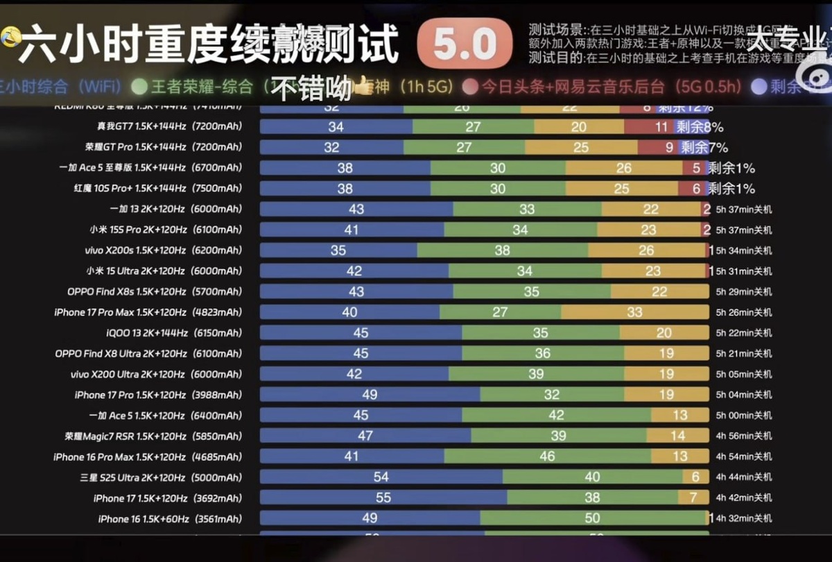 Китайский нагрузочный тест аккумуляторов разных смартфонов, включая iPhone 17. iPhone 17 : 4ч 42м iPhone 17 Pro : 5ч 04м iPhone 17 Pro Max : 5ч 26м Galaxy S25 Ultra : 4ч 44м iQOO 13 : 5ч 22м OPPO Find X8s : 5ч 29м Vivo X200s : 5ч 34м OnePlus 13 : 5ч 37м