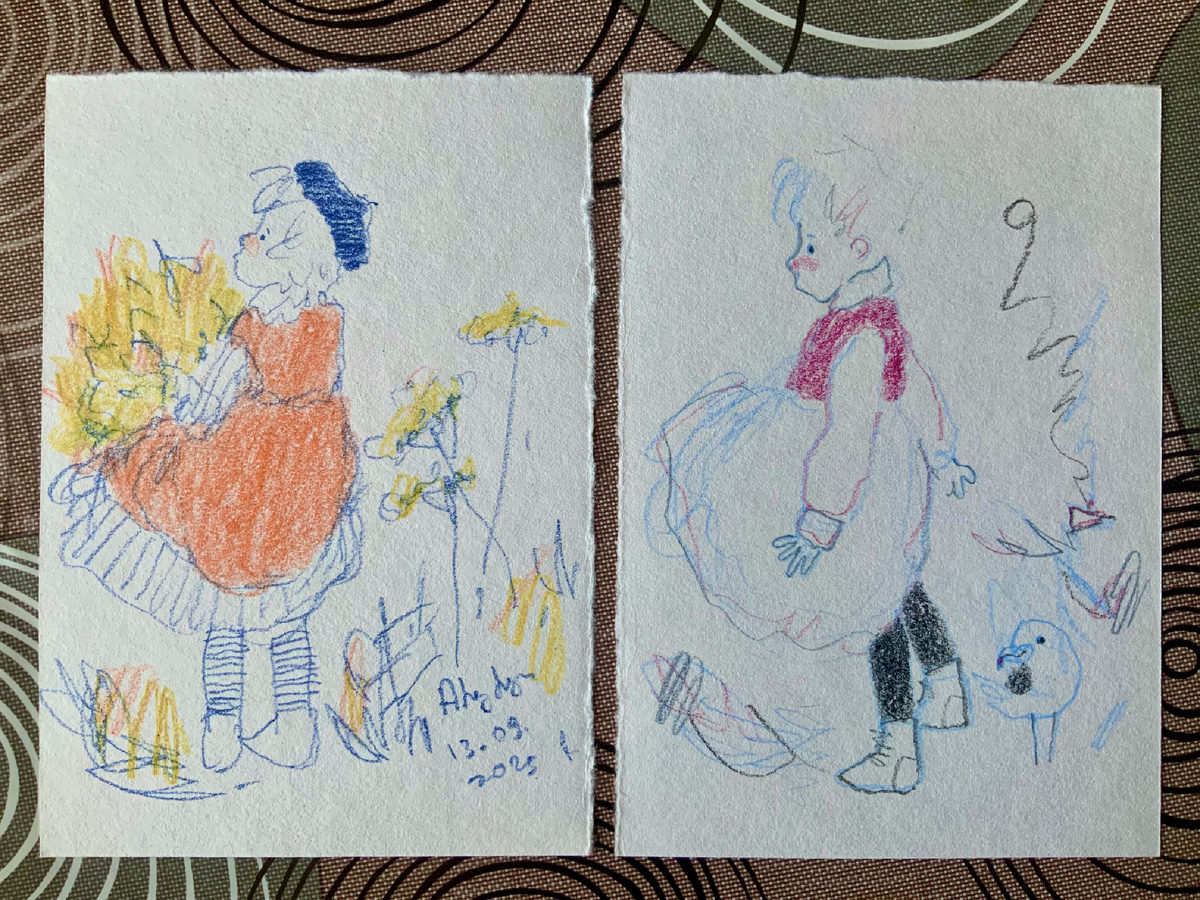 Этот рисунок я нарисовала раньше опубликованных в предыдущем посте, но запуталась с хронологией, и вот, публикую его только сейчас. Это тоже осенние девочки. Мне интересно показать как их характер на фоне меняющегося сезона, нового времени года, так и их внешний вид, одежду. Платье-туника, полосатые или черные/темно-синие чулки, береты, ботинки, фартуки, накидки и жилеты — все это интересно рисовать. И, конечно, окружающий мир — чайки, корабли, травы, листья! 🍁 🌊 🚢