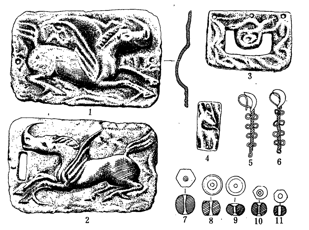 Односторонние и двусторонние бронзовые бляхи найдены в большом количестве. В основном найдены в ногах умершего, в отверстиях на обратной стороне сохранились остатки кожаных шнурков, возможно, это украшения для сапог. Бляхи с изображением фантастических животных и бляхи с тигриным и оленьим узором чаще всего появляются у пояса умершего и являются украшениями на поясе.