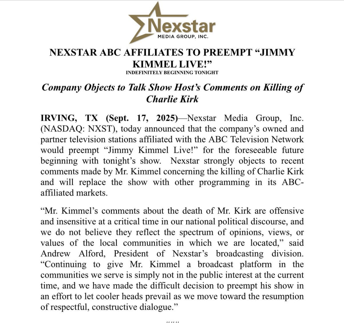 Nexstar says Kimmel’s comments on Charlie Kirk 'offensive and insensitive'