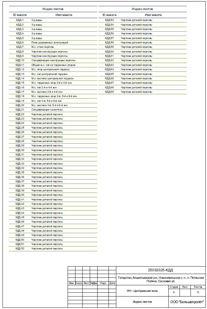 Индекс листов и избранные листы проекта КДД зоны рекреации для пансионата