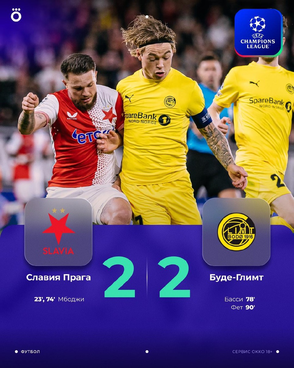 «Буде-Глимт» красиво камбэкнул в Праге, а «Пафос» выстоял в меньшинстве на выезде – есть первые очки у дебютантов ЛЧ! 🫡