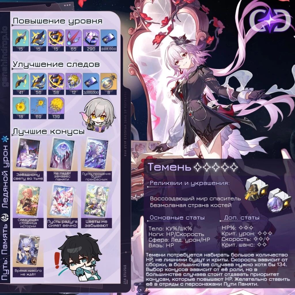 ㅤУ Темени нет плохих Эйдолонов. Если вы хотите сделать из Темени очень качественного саппорта в команды Памяти, то первый Эйдолон существенно усилит отряд. Если у вас цель сделать Темень основным сильным дамагером, то рекомендуется присмотреться ко второму эйдолону. В случае же ограниченного бюджета вы можете рассматривать либо первый эйдолон, либо Световой конус, по полезности для Темени они будут одинаково равны.