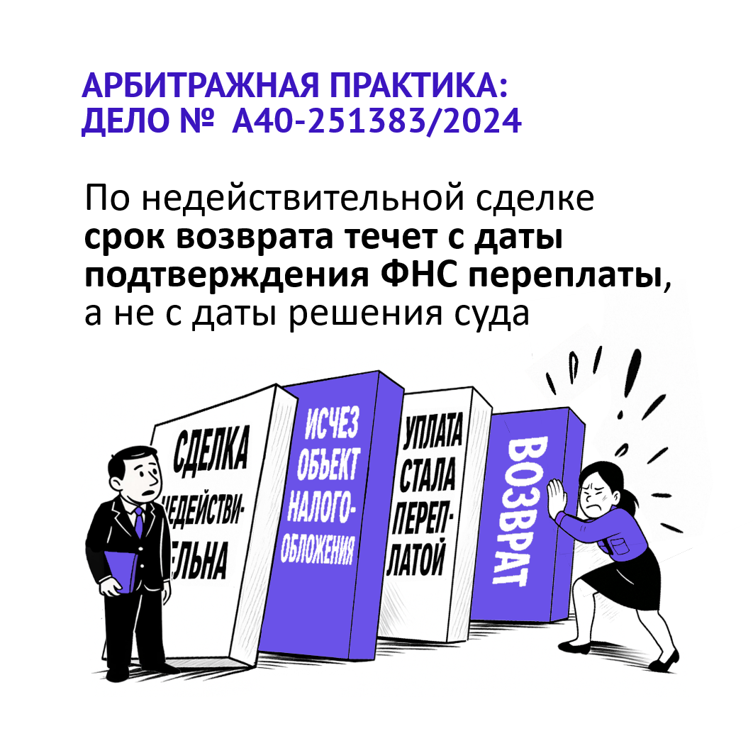 Из-за признания сделки недействительной было утрачено основание для налога, из-за утраченного основания уплаченный налог стал переплатой, из-за отказа вернуть эту переплату налоговый орган проиграл спор по делу № А40-251383/2024.