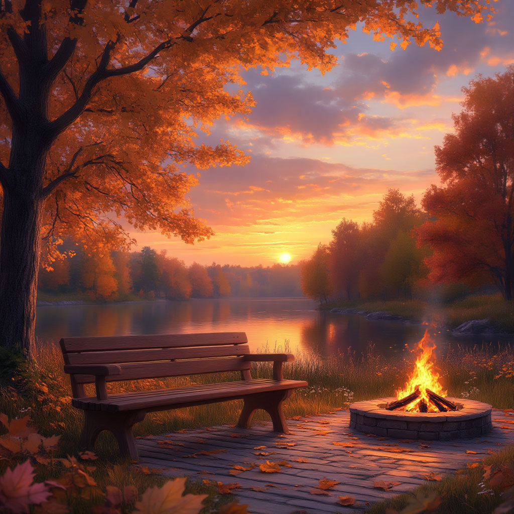 Представьте, что вы находитесь в месте, где время словно замедляет свой бег. Осенний вечер окутывает вас мягким золотистым светом, словно заботливые руки старого друга. Солнце, подобно мудрому наставнику, медленно опускается за горизонт, окрашивая небо в оттенки розового и оранжевого — цвета, которые символизируют трансформацию и принятие. Вы сидите на деревянной скамейке, которая кажется продолжением земли, частью природы. Это место — метафора вашей внутренней опоры, той части вас, которая всегда остаётся неизменной, несмотря на внешние бури и перемены. Костёр перед вами — символ внутреннего огня, вашей жизненной энергии, которая, подобно танцующему пламени, постоянно движется и меняется, но никогда не гаснет полностью. Под вашими ногами — ковёр из опавших листьев. Каждый лист — это прожитый момент, опыт, который вы отпустили, чтобы освободить место для нового. Шуршание листьев под ногами — это звук вашего личного пути, шаги, которые вы делаете к самопознанию. Вдыхайте аромат осени —