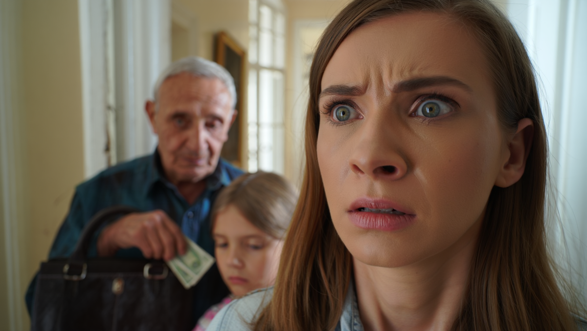 Свекор открыл сумку, достал кошелек и начал в нем рыться. Потом взял несколько купюр и сунул их в карман халата. Вернул кошелек обратно и пошел к себе в комнату.