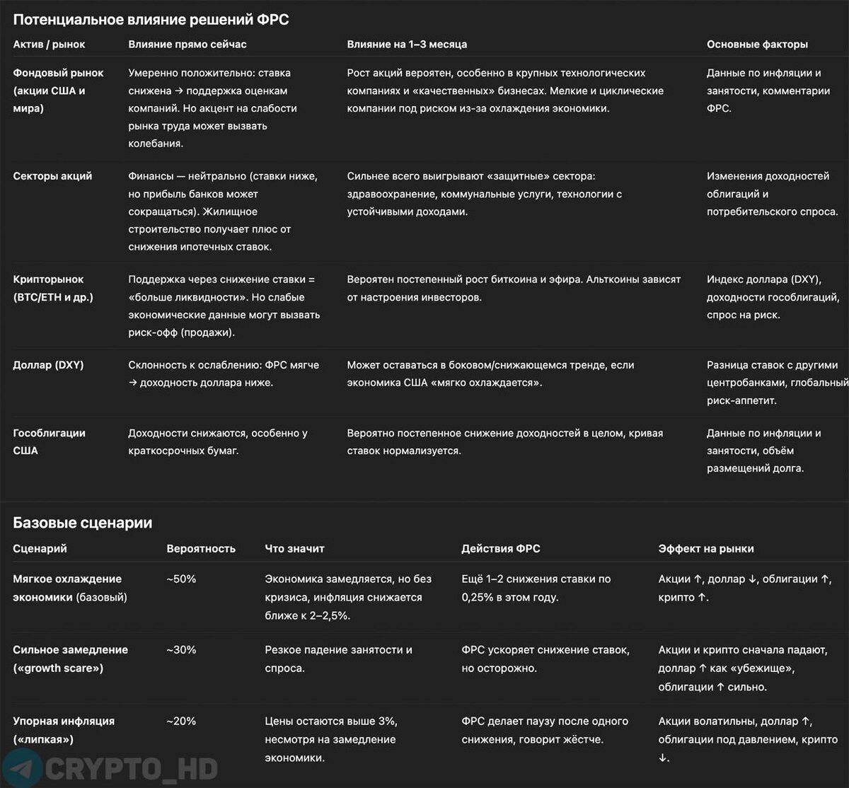 😐 Выводы по заседанию ФРС + потенциальная реакция рынка (ответ Chat GPT-5) ➥ Ставка снижена до 4,25% (-0,25%), прогнозируются еще 1-2 снижения в 2025 → краткосрочный позитив. ➥ Фондовый рынок: акции получили импульс, но осторожные комментарии Пауэлла ограничили эйфорию. ➥ Доллар (DXY): склонен к ослаблению, но неопределенность по инфляции удерживает спрос на защитные активы. ➥ Гос. облигации: доходность снижается, особенно у ценных бумаг на 10 лет и больше. ➥ Крипторынок: снижение ставок и слабый доллар = плюс для BTC/ETH, но «сдержанная ФРС» мешает рынку уйти в ралли. ➥ Итог: ФРС дала рынкам поддержку, но риторика Пауэлла «съела» львиную долю позитива. Подробнее - см. таблицу выше. Ранее: - решение по ставке - сопроводительное письмо - выступление Дж. Пауэлла Crypto Headlines