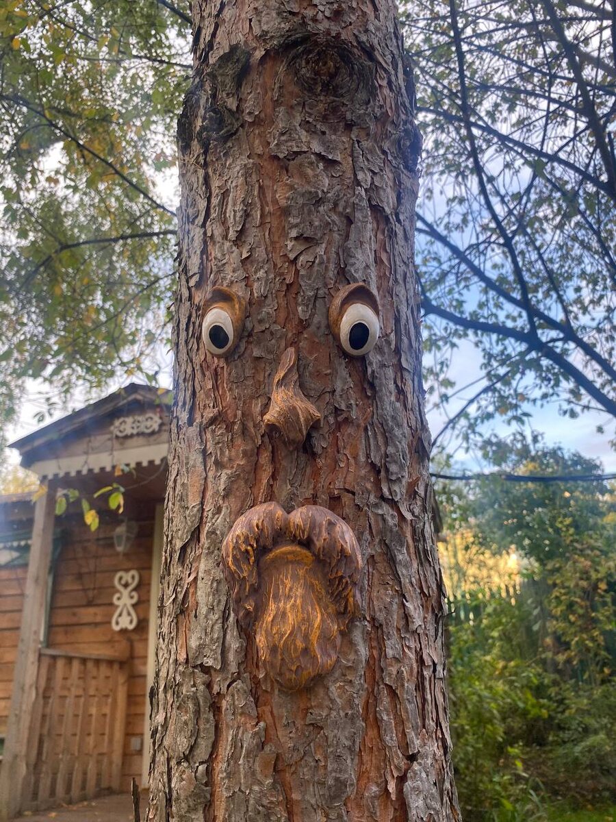 Вот такой милый страж появился у нас с легкой руки нашего гостя, который приезжает к нам очень часто! Что может быть дороже вашего внимания?!!! Только ваши улыбки в избушкиной копилке!!! На старой осине в глуши лесной Жил леший, глазастый и волосатый. Для лешего был он еще молодой - Лет триста, не больше. Совсем не злой, Задумчивый, тихий и неженатый. Однажды у Черных болот, в лощине, Увидел он девушку над ручьем, Красивую, с полной грибной корзиной И в ярком платице городском. Видать, заблудилась. Стоит и плачет. И леший, вдруг словно затосковал... Ну как ее выручить? Вот задача! Он спрыгнул с сучка, и уже не прячась Склонился пред девушкой и сказал: - Не плачь! Ты меня красотой смутила. Ты - радость! И я тебе помогу!- Девушка вздрогнула, отскочила, Но вслушавшись в речи, и вдруг решила: "- Ладно, успею еще! Убегу!" А тот протянул ей в косматых лапах Букет из фиалок и хризантем. Итак был прекрасен их свежий запах, Что страх у девченки пропал совсем... Свиданья у девушки в жизни