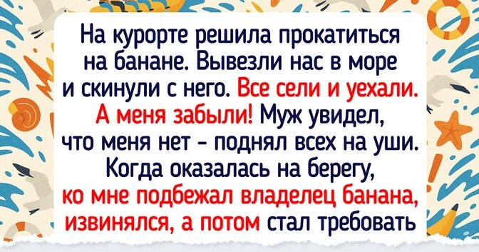 Решила добавить острых ощущений — прокатиться на буксируемом банане. Весело, шумно, все прыгают в воду, потом садятся обратно… но меня просто забыли. Осталась одна посреди моря. Ни берега, ни судна, только волны и паника. Включился автопилот — поплыла. Добралась до берега полумёртвая. Вылезаю — ко мне подбегает владелец: «Извините!.. А теперь оплатите, пожалуйста». Я чуть не утонула, а он хочет деньги?! Да вы серьёзно?!