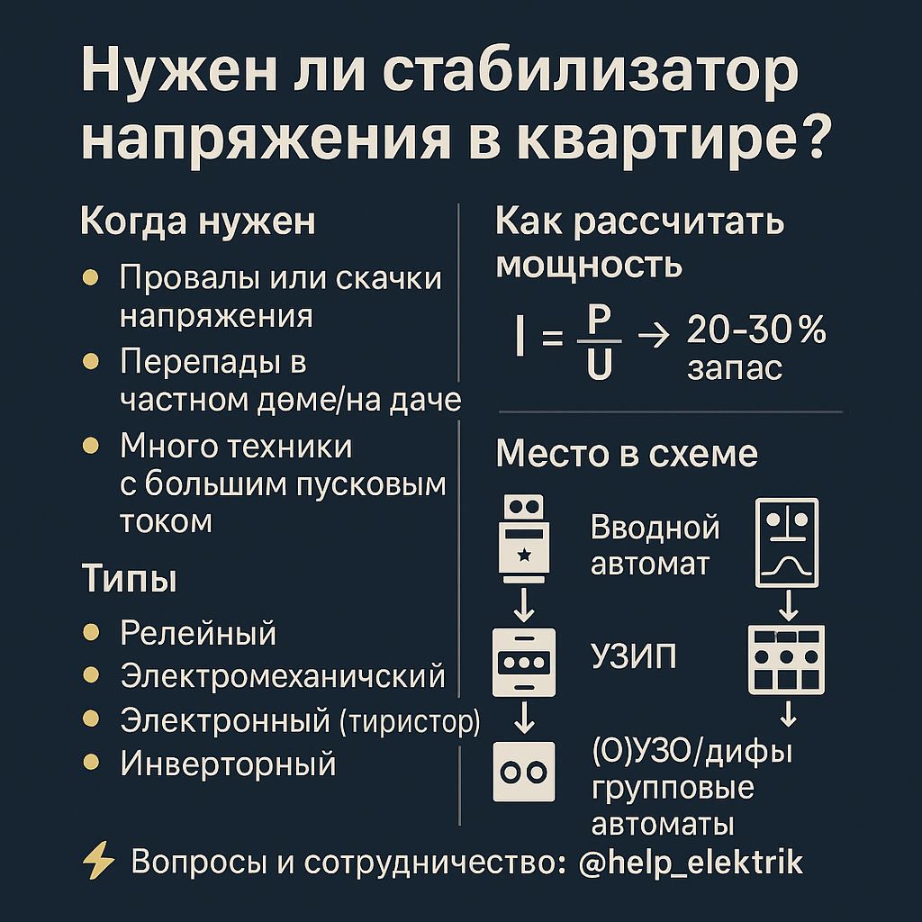 Скачки и просадки напряжения — частая причина поломки техники и «залипаний» электроники. Разберёмся, когда стабилизатор действительно нужен, как его выбрать и куда ставить. --- Когда нужен стабилизатор Провалы напряжения ниже ~200 В или подъёмы выше ~240 В (видно по «тускнеющему» свету, греющимся БП, перезагрузкам роутера/ТВ). Конец линии / частный дом / дача — длинные вводы, сезонные перегрузки. Много мощной техники (насосы, обогреватели, компрессоры) с пусковыми токами. Зафиксировали проблемы измерениями: умная розетка/логгер показывает частые выходы за 200–240 В. Когда можно обойтись без него Напряжение держится в норме 200–240 В большую часть суток. У вас только низкомощная электроника с качественными БП, и нет симптомов (мерцания, перезагрузок). --- Важно не путать устройства Стабилизатор — выравнивает напряжение. УЗИП — защищает от импульсных перенапряжений (грозы, включения/отключения). УЗО/диф — защищает человека при утечке тока. Автомат — от перегрузки и КЗ