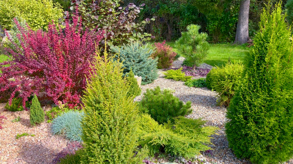 Ели, туи, можжевельники и сосны разной окраски хвои, размера и формы кроны позволяют рокарию сохранять декоративность все четыре сезона. При этом ухода или не требуют совсем, или, при необходимости, весенней санитарной или формирующий обрезки в июне.