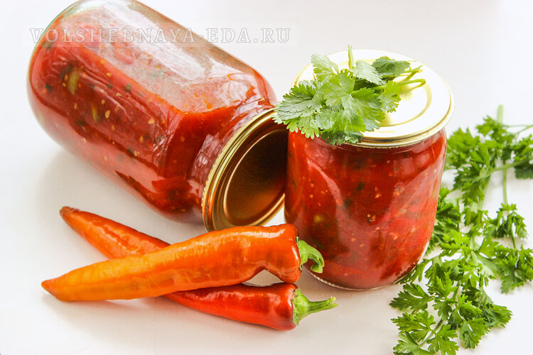 «Бари ахоржак!» в переводе с армянского означает «Приятного аппетита!» Отсюда название острой армянской закуски ахорджак, что буквально значит «добрый аппетит». Закуска полностью отвечает своему названию, аппетит разыгрывается только от одного ее вида. По сути, это рецепт армянской аджики. Острый перец (цицак) заливается томатным соусом, с ароматным чесноком и травами. Закуску можно подать к столу сразу же либо заготовить впрок. Сегодня я расскажу, как приготовить ахоржак на зиму. Для удобства я привела полные пропорции, а также свои расчеты для частичной порции (выход 1,5 литра готового соуса), чтобы вам не пришлось все пересчитывать. Общее время: 60 минут | Время приготовления: 40 минут Выход: 1,5 л | Калорийность: 44.02 кКал на 100 г для полной порции: для частичной порции (на 1,5 литра): Острый перец помыть, каждый стручок разрезать вдоль — пополам, не доходя до плодоножки. Армяне для этой закуски используют специальный сорт перца — зеленый цицак (на этой стадии спелости он слабо