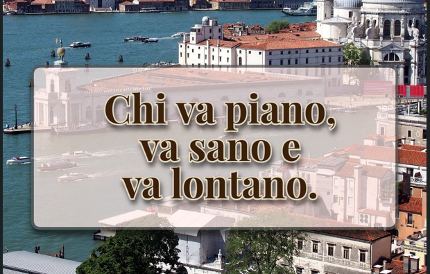- Chi non va piano, non va sano e non va lontano. – Кто не идет осторожно/медленно, не идет здоровым и не идет далеко. (Здесь привожу дословный перевод данной фразы на русский, поэтому звучит не совсем корректно, но зато соответствует построению итальянской фразы.)