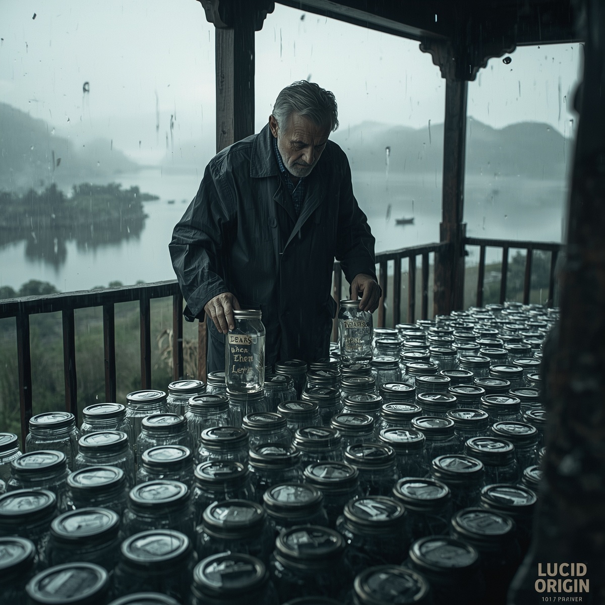 “Дождь, когда началось всё” — Зачем? — спросил я его однажды, стоя под навесом, пока он аккуратно переливал капли в стеклянную банку с надписью “Последний день на Земле”.