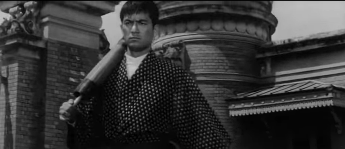 Как демон, Гэндзабуро в каждой значимой сцене появляется из тьмы. Вот первая встреча братьев Хигаки с Сугатой Сансиро. До тех пор, пока Сугата себя не назвал, Гэндзабуро практически незаметен: