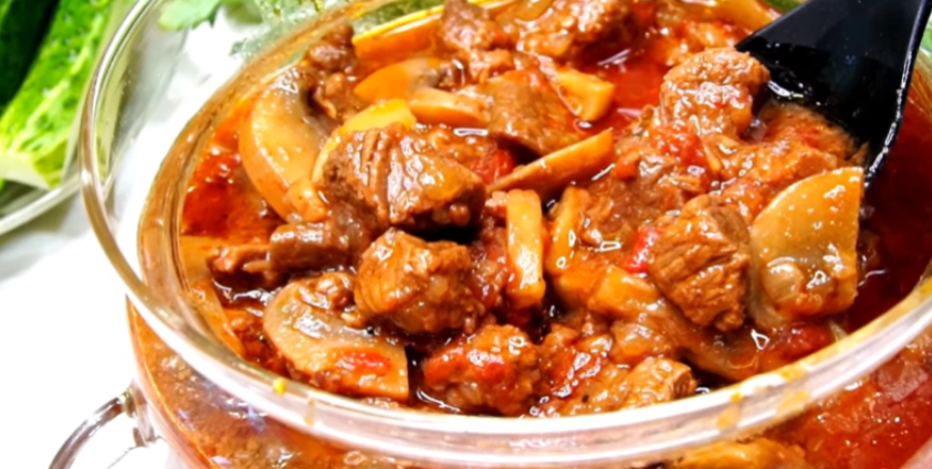 Нежное, тающее мясо в соусе, нам оно не надоедает никогда! Мясо получается такое мягкое и нежное, лишь стоит на него только надавить и оно рассыпается. Рекомендую очень вкусно и просто. Сразу варю 2-3 порции, затем убираю в холодильник, когда нужно подавать к столу, я быстро готовлю любой гарнир, например картофель, макароны, гречку, рис и поливаю разогретым мясом в соусе. Дополняю овощным салатом или малосольными огурчиками. Ужин или обед готов. Рецепт: СПОСОБ ПРИГОТОВЛЕНИЯ Сегодня я делаю рецепт на 1 порцию (по желанию можете увеличить порцию в расчете на количество дней). Мясо говядины 500 грамм разрежем кубиками. Можно мясо любое на Ваше усмотрение. 2 больших луковицы разрежем четверть кольцами. Шампиньоны 250 грамм разрежем пластинками. В кастрюлю наливаем растительное масло 3-4ст.л. и обжарим лук до полупрозрачности, теперь добавляем мясо. Перемешиваем с луком, жарим минуты 2-3 с луком. Чтобы мясо поменяло цвет и появилась жидкость. Теперь сразу добавляем шампиньоны, 300 грамм то