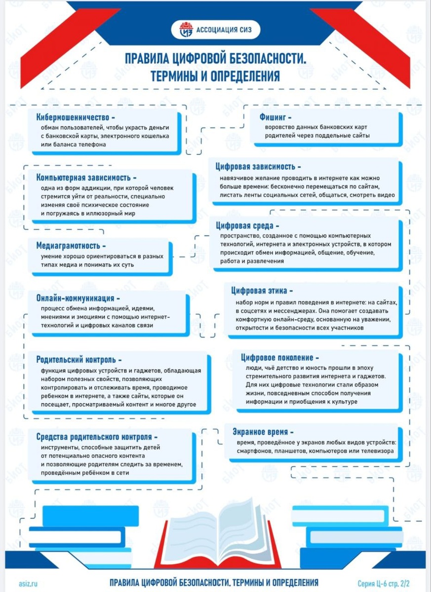 Дорогие друзья! 📱В наше время цифровые устройства стали неотъемлемой частью нашей жизни. 💻 К сожалению, цифровые устройства не только облегчают и упрощают процесс обучения, но одновременно несут и риски цифровой зависимости детей, утечки данных, кибербуллинга и другие. 🖥 8 наглядных модулей по правилам цифровой безопасности закроют базовое понимание вопроса, подскажут на что обратить внимание и как предупредить негативные последствия: • средства родительского контроля; • угрозы в интернете; • рекомендации по обеспечению интернет-безопасности детей; • статистика; • рекомендации международных и российских организаций по вопросам здравоохранения; • термины и определения; • цифровая зависимость детей и подростков; • профилактика цифровой зависимости детей и подростков. Инфографика разработана Ассоциацией «СИЗ» при участии студентов Государственного Университета Управления, Института маркетинга, Кафедры рекламы и связей с общественностью.