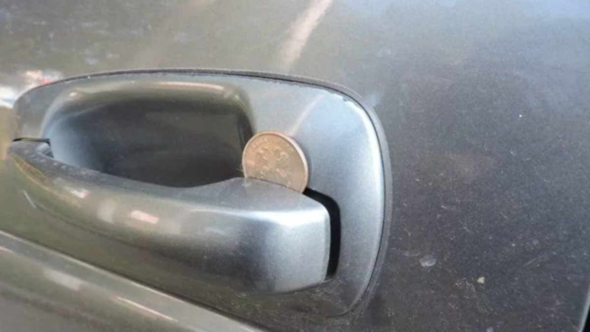 Трюк работает так. Злоумышленник слегка тянет ручку двери на себя, выбирая люфт. Замок при этом остаётся закрытым, но в образовавшийся зазор вставляется монета. Всё. Машина внешне выглядит нормально: двери закрыты, сигнализация стоит, никаких признаков беды.