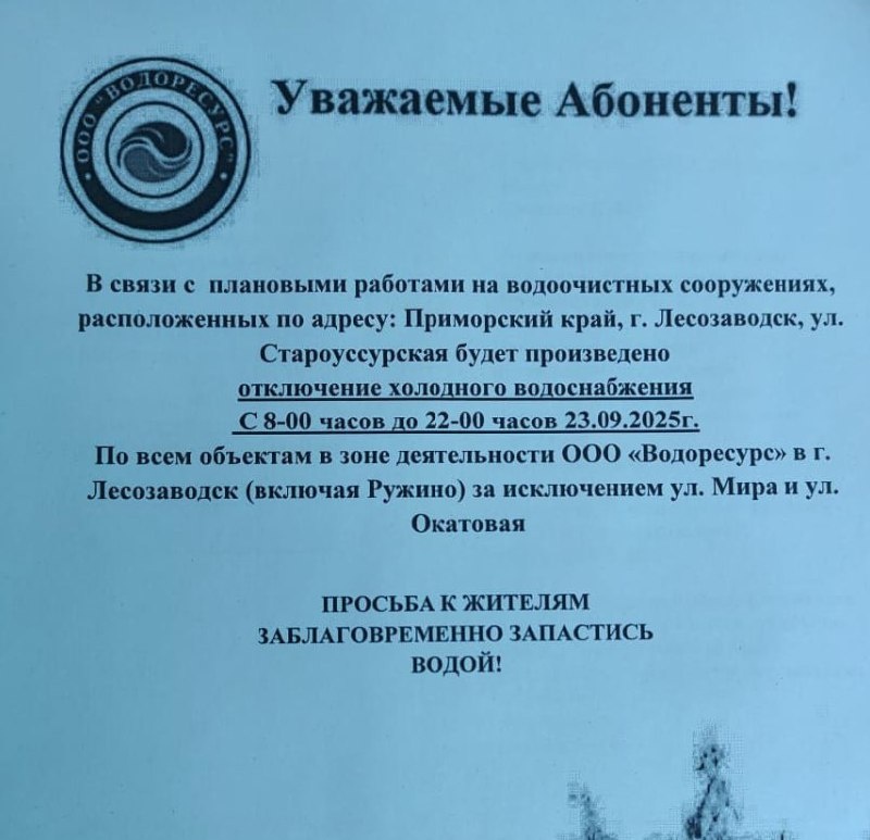 💦 Отключение водоснабжения будет по всему городу, кроме ул. Мира и ул. Окатовая