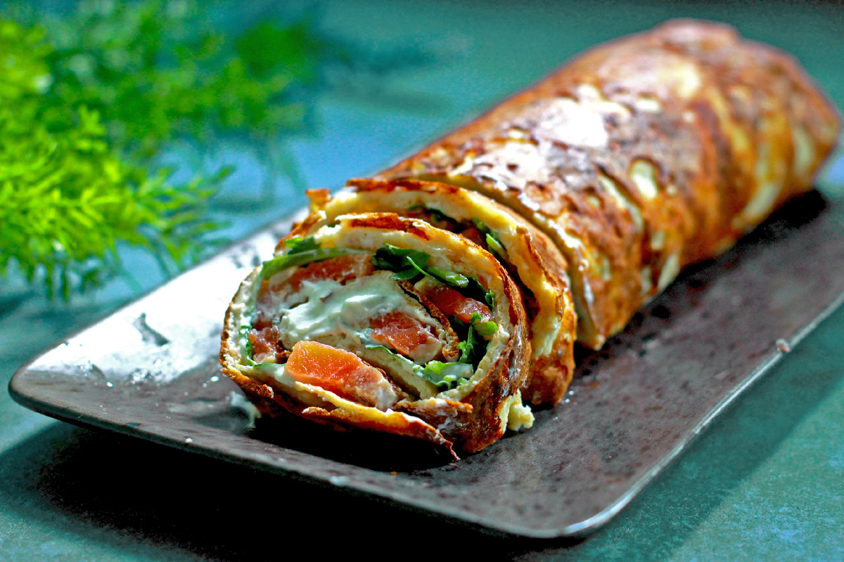 Рулет на лепешке из творога и яйца. Муки не нужно совсем никакой, а вкус очень достойный. ✔ Творог зерненый в сливках (в баночках) – 250 г; ✔ Яйца – 3 шт.; ✔ Соль – щепотка; ✔ Чеснок гранулированный – 0,5-1 ч. л.; Травы сухие пряные – 0,5 ч. л. Застелите противень пергаментом так, чтобы был небольшой бортик. Духовку разогреть до 180 градусов. В блендере пробить творог в сливках (если брать обычный творог, то надо увеличивать количество яиц до жидкого состояния «теста») вместе с остальными ингредиентами. Тесто очень жидкое. Аккуратно вылить его на противень, распределить равномерно по всему противню. Пергамент должен быть отличного качества, или можно взять тефлоновый коврик, но обязательно застелить так, чтобы тесто не пролилось на сам противень. Запекать около 30 минут до румяности. Тесто будет покрываться крупными пузырями, которые разровняются после выпечки. «Корж» остудить, снять с противня, смазать творожным сыром или рикоттой (~100 г), выложить по поверхности любую начинку (у мен